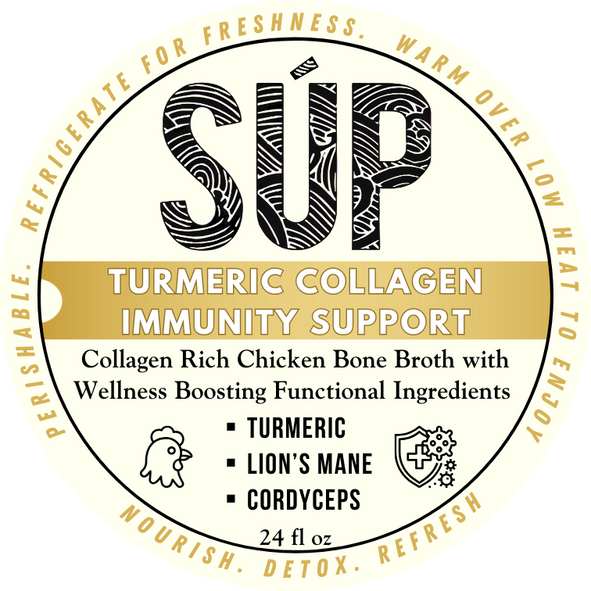 Sip with intention. Súp’s Turmeric Collagen Immunity Bone Broth is a carefully crafted blend of organic chicken bones, aromatic vegetables, turmeric, and functional mushrooms like Lion’s Mane and Cordyceps — all simmered to create a collagen-rich broth with a warm, savory profile.